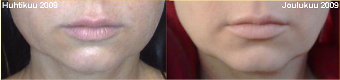 Ihan selvää muutostahan tuossakin näkyy. Leukalinjani on jotenkin napakampi ja selkeämpi. Ja kulmikkaampi… tuo kulmikkuuden lisääntyminen on kyllä aika jännä juttu, en osaa oikein päättää onko se osittain kuvakulman tuotosta vai onko tosiaankin leukani nykyään noin eri mallinen. Itse kuitenkin pidän nykyistä peilikuvaa ihan mukavana, kun vaan vielä saisi nuo kulmat pois tuolta leuan sivuilta – ne eivät minusta leukaani kuulu. Aina välillä nuo kulmat ovat vähän piilossa, välillä ne ovat selkeämmät. Kuvittelen, että jumppaamalla ne katoavat joskus kokonaan. Haaveilen sellaisesta pyöreästä leuasta, joka minulla oli nuorena 😀 Tuossa uudemmassa kuvassa muuten hämää vähän se, että olen itse ottanut sen kännykkäkameralla, joten minusta siinä tulee hiukan kalansilmäefektiä (joka siis korostaa kasvojen keskiosaa, esim. levittää leukaa).